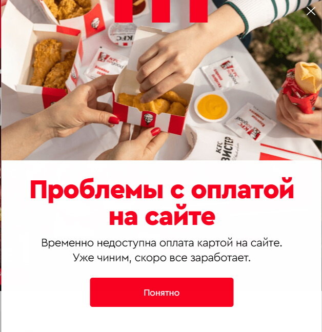 Сегодня, 1 июня 2022 года у сети ресторанов быстрого питания KFС произошел масштабный сбой в способах оплаты. А ведь именно сегодня после долгого перерыва КФС запустило акцию "Купон 5050". Напомню, что данный купон действует только по средам и дает возможность получить 2 блюда по цене 1. На этой раз предлагалось весьма выгодное предложение "2 Бургер Сандерс Де Люкс по цене 1". Только в этот раз появилось весьма неприятное ограничение: "Действует при заказе с собой в мобильном приложении". До этого я уже пробовал пользоваться приложением KFC и оно оказалось нерабочим, так как содержало в себе критические ошибки. Что ж, может по прошествии времени ситуация изменилась к лучшему? С этой мыслью скачиваю приложение для Android. Проверяю на вскидку - вроде бы работает. Осталось проверить на практике. Подъехав в ресторан, пробую оформить заказ самовывозом. Нажимаю кнопку "Оплатить". Выводится панель "Способ оплаты", но она пуста - ничего нельзя выбрать. Только кнопка "Готово", при нажатии на к