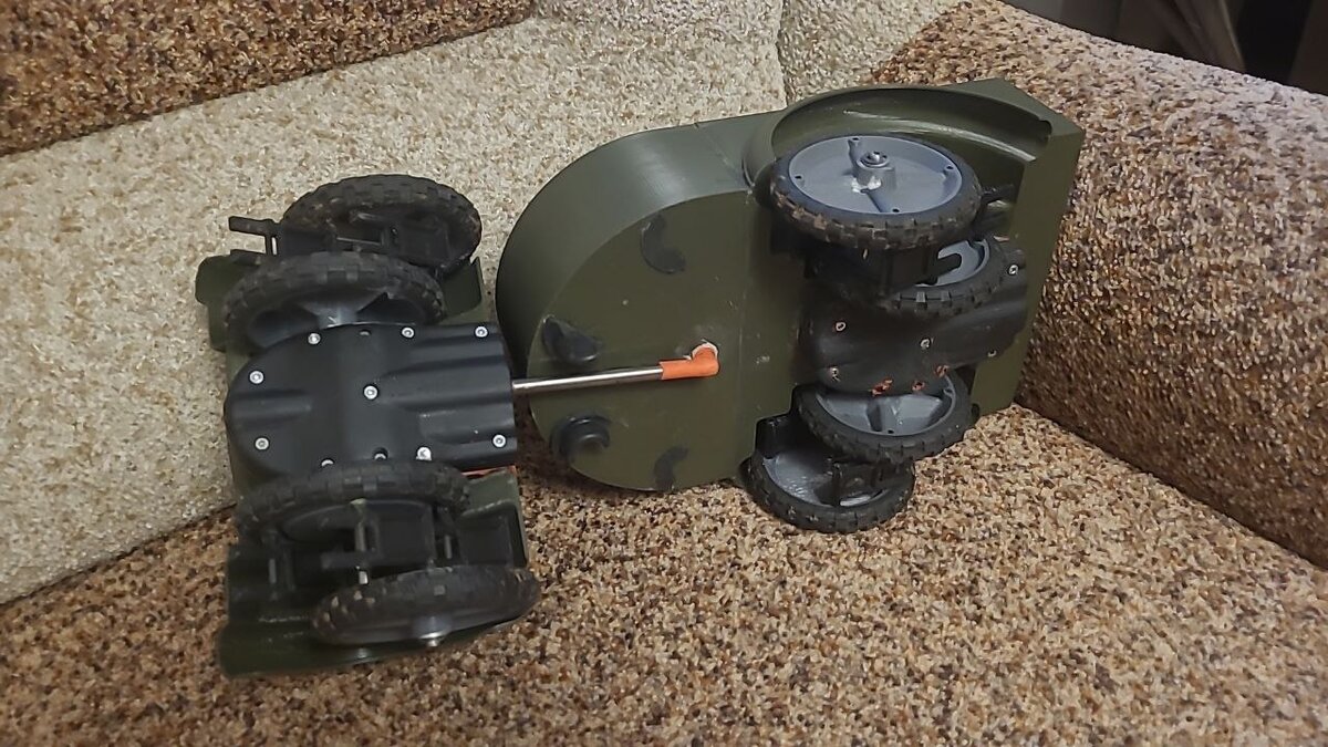 - для движения при преодолении вертикальных препятствий используется зацепление, описанное в двух предыдущих пунктах, или заостренным профилем в концах траков, имеющих только один шарнир соединенный через колесо торсионом с другим траком.