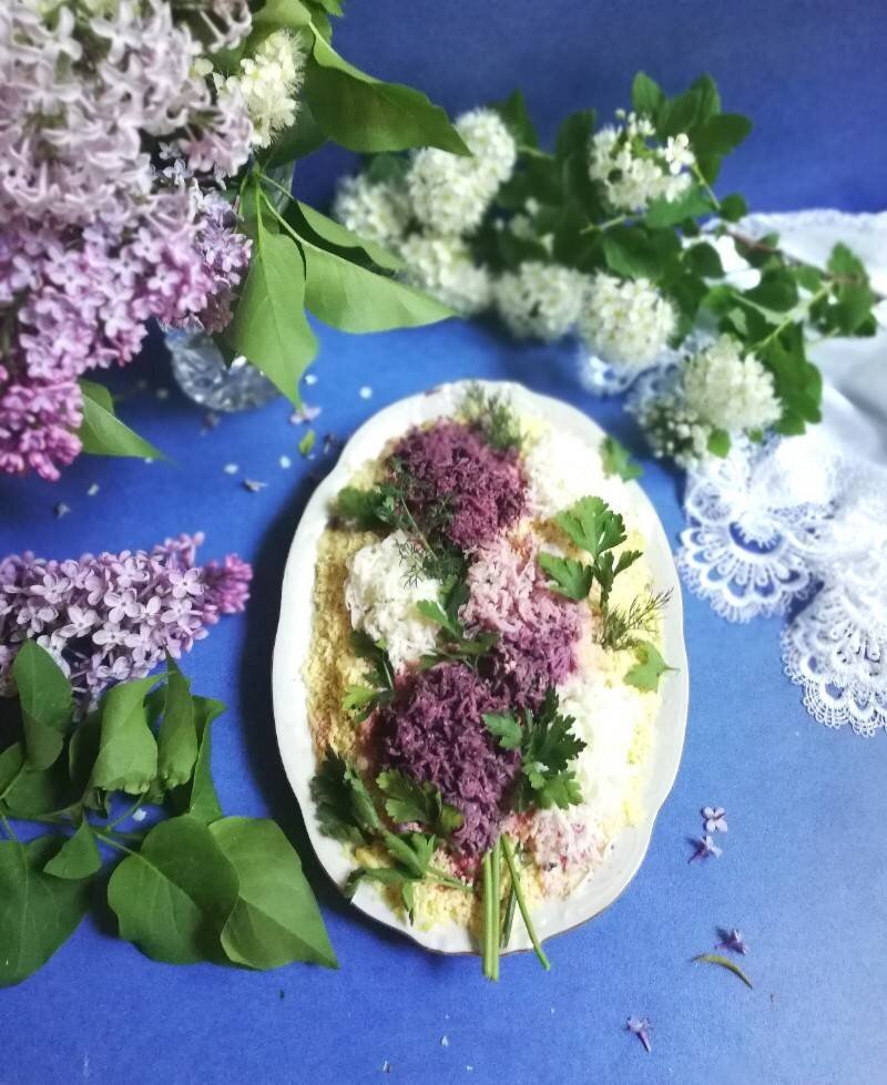 Ингредиенты: отварной картофель, консервированный тунец, репчатый лук, маринованные огурцы корнишоны, отварных яйца, майонез, ст.л уксус, ч. л сахар, ч. л соль, укроп, петрушка для украшения Способ приготовления: Отварной картофель натереть на тёрке. Лук мелко нарезать. Мариновать в уксусе, сахаре, соли 10 минут. Из банки с тунцом слить жидкость. Рыбу размять вилкой. Мелко нарезать огурцы. Салат складывать слоями: картофель, майонез, тунец, маринованный лук, майонез, огурцы, картофель, майонез. Желтки натереть на мелкой тёрке. Ровным слоем посыпать сверху салат. Натереть белок. Разделить его на две части. Одну покрасить свекольным соком. Выложить кучками белок. Сделать листочки из зелени.