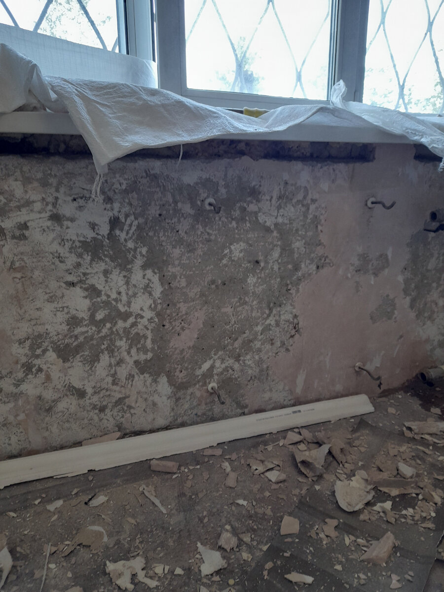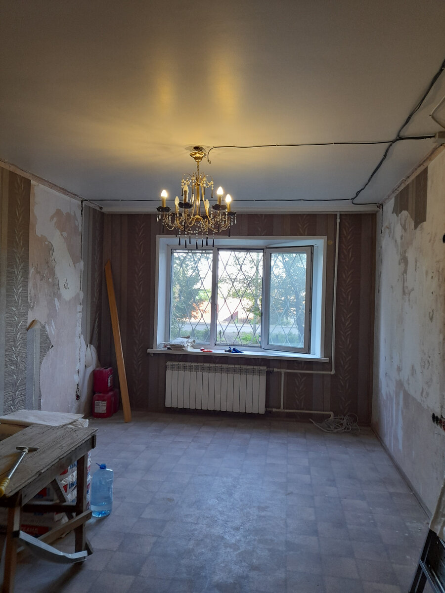 В моем примере - стандартная гостиная, которая находится в 3-комн. квартире в панельной девятиэтажке на первом этаже. В конце прошлого года мы делали в ней ремонт спальни заказчицы и гостевой комнаты, и вот спустя 5 месяцев вернулись продолжить ремонт гостиной. Главное условие заказчицы - это визуально ровные стены, углы, пол. В общем, чтобы в итоге все выглядело красиво и достойно. В этой статье, я покажу в какой последовательности мы выполняем все работы, сколько и какого материала использовали при отделки комнаты, и сколько дней у нас на это ушло. На тот момент, когда заказчица позвонила и сообщила, что она готова продолжить ремонт, мы заканчивали работу на другом объекте. Поэтому, сделать новую разводку электропровода от счетчика, она пригласила местного электрика. В процессе он так же сделал дополнительные силовые точки на розетки под ТВ, кондиционер и т. д. Как выглядела гостиная, когда мы пришли в первый день. Начали по стандарту с демонтажа старого покрытия: обоев, шпаклевки.