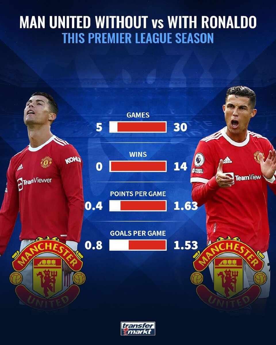 Сравнительная статистика «Манчестер Юнайтед» в этом сезоне в матчах с участием и без участия Криштиану Роналду
