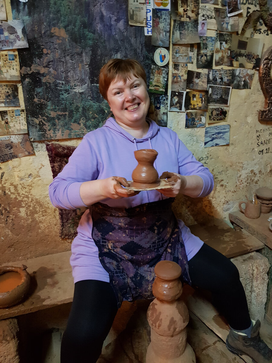 В первый раз я попробовала гончарное ремесло в России на Соловках, а через несколько лет мне удалось повторить этот опыт в Турции. Один раз - в Каппадокии, в городе Аванс, который славится своими гончарами и с удовольствием предлагает туристам поучиться, второй раз - в городе Конья, куда меня привезли художники по керамике. Итак, что у меня получилось в мастерской Аваноса: Горшочек получился неказистый, но я с гордостью его показываю. Мастер был "под мухой" и упорно мешал мне сделать свою вазу. Возможно, поэтому получилось кривовато. Затем я вырезала на вазе-горшочке год и три буквы. Вы ни за что не догадаетесь, что они обозначают! Потому что это - инициалы нашей маленькой компании - меня и молодой пары, которые подобрали меня на дороге и по своей инициативе привезли сюда. Их звали Мустафа и Суда. А вот мои творения из Коньи: Профессиональный гончар не говорил по-английски и не привык общаться с туристами. Мои сопровождающие - семья художников- переводила и помогала нам понять дру
