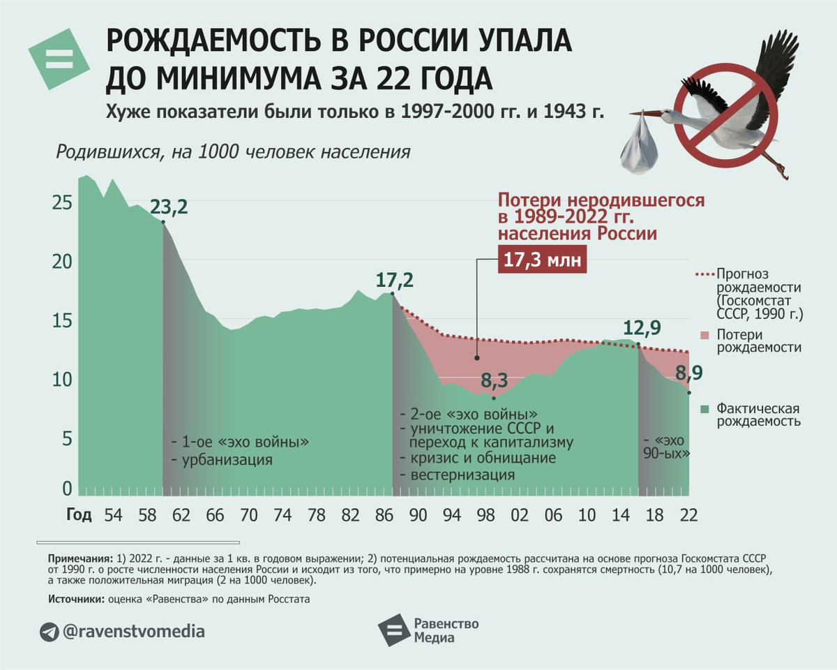 Рождаемость в русских регионах России упала до отметки ниже рождаемости во время Великой Отечественной Войны. С начала этого года за первые три месяца на свет появилось всего 320 376 детей на всю Россию. Это один из худших показателей за всю историю страны. Исторический антирекорд установлен в 1999 г. – 8,3 рождений на 1000 человек. Даже в разгар фашистской оккупации в 1943 г. рождаемость в России упала “всего” до 8,6 на 1000 человек. К 2022 г. по прогнозу статистиков населения России должно было быть 172,8 млн человек с учетом Крыма. Развал страны в девяностые обошелся нам всем в 27 млн. человек. Из них около 10 млн Россия потеряла из-за сверхсмертности, а 17 млн человек – из-за спада рождаемости. Только возврат к русской общинности, своим традициям и надежной взаимовыручке в обычной жизни помогут нам создавать крепкие многодетные семьи. Только так остановим вымирание русских регионов.