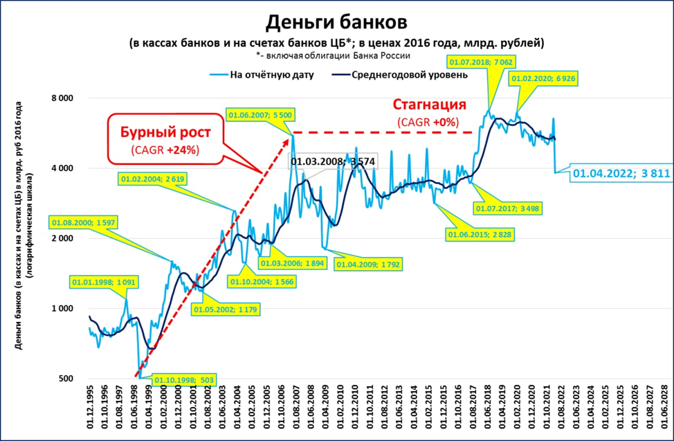 1. Против первого пункта я не возражал изначально, лишь отметил, что банки, желающие наращивать рублёвые обязательства перед клиентами при сокращающихся рублёвых резервах банков, ещё надо поискать (см. картинку).