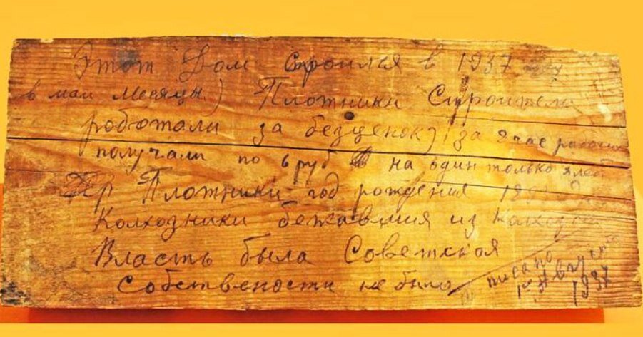 И в этом смысле история — это то, что происходит с нами везде, где бы мы ни были. Но если речь идет о «нашей» истории – сердце невольно замирает, ведь это наше прошлое... Короче говоря, в Тосно при разборе старого детского сада рабочими была обнаружена доска с посланием 1937 года. Это было обнаружено недавно в городе Тосно Ленинградской области. Некий неизвестный написал о том, что его тревожило. А ниже приводится дословный текст автора: Этот дом строился в 1937 году в мае месяце. Плотники строители работали за бесценок, за 8 часов работы получали по 6 руб. на один только хлеб. Плотники год рождения 1893. Колхозники, бежавшие из колхоза. Власть была Советская. Собственности не было. Писано 1 августа 1937. В настоящее время эта находка находится в Тосно в музее, который был передан в 2003 году. По словам эксперта, данная доска не является подделкой, что подтверждается почерком, стилем написания и состоянием самой доски.