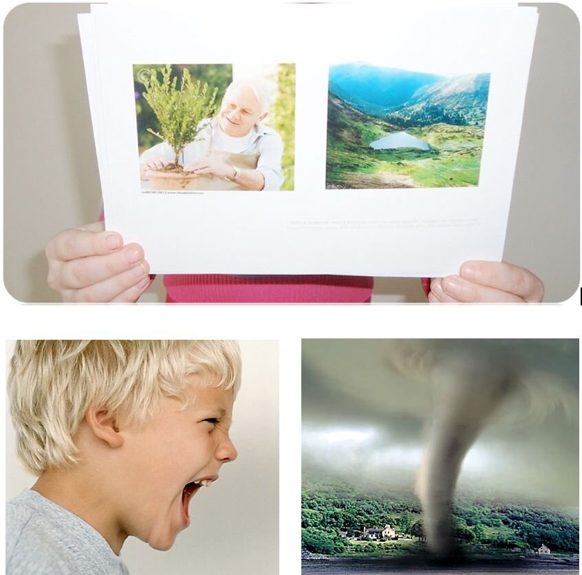 Например, на одной фотографии – умиротворённый малыш, а на другой – ясное небо, на одной – раздражённая девочка, а на другой – извержение вулкана. Или: кричащий ребёнок и ураган.