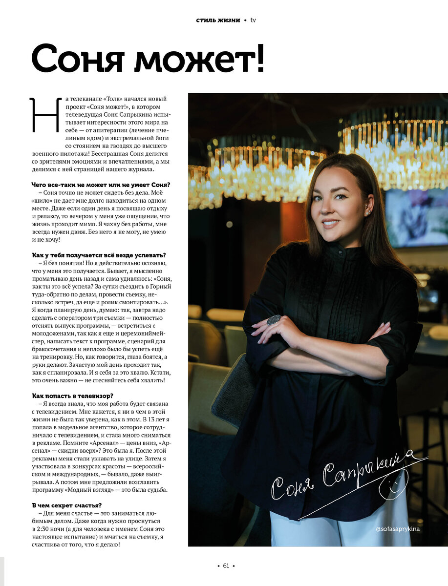 На телеканале «Толк» идёт проект «Соня может!», в котором телеведущая Соня Сапрыкина испытывает интересности этого мира на себе — от апитерапии (лечение пчелиным ядом) и экстремальной йоги со стоянием на гвоздях до высшего военного пилотажа! Бесстрашная Соня делится со зрителями эмоциями и впечатлениями, а мы делимся с ней страницей нашего журнала. – Чего все-таки не может или не умеет Соня? – Соня точно не может сидеть без дела. «Шило в одном месте» — это про меня. Даже если один день я посвящаю отдыху и релаксу, то вечером у меня уже ощущение, что жизнь проходит мимо. Я чахну без работы, мне всегда нужен движ. Без него я не могу, не умею и не хочу! – Как у тебя получается всё везде успевать? – Я без понятия! Но я действительно осознаю, что у меня это получается. Бывает, я мысленно проматываю день назад и сама удивляюсь: «Соня, как ты это всё успела? За сутки съездить в Горный туда-обратно по делам, провести съемку, несколько встреч, да еще и ролик смонтировать…». Я когда планирую ден