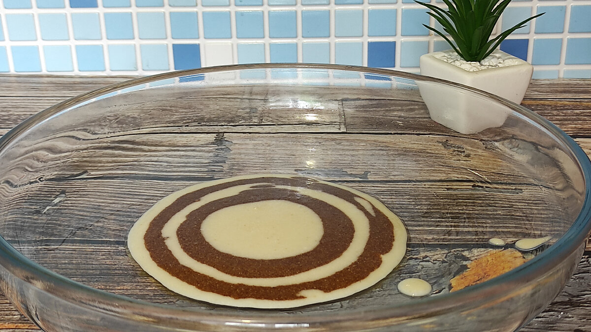 Поочередно выливайте тесто: ложку белого, ложку коричневого прямо в центр.