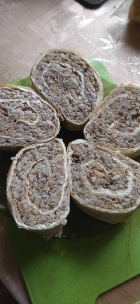 #традиции #Братск Ингредиенты: лаваша, творожного сыра, сухого риса, консервированной рыбы, репчатый лук, майонез для заправки, соль Способ приготовления: Рис отварить до готовности в подсоленной воде. Из консервированной рыбы слить лишнюю жидкость, удалить у рыбы хребты, слегка измельчить и смешать с остывшим рисом. Заправить майонезом. По желанию добавить мелко нарезанный лук. На половину лаваша тонким слоем нанести творожный сыр. На вторую половину лаваша ровным слоем выложить рыбно-рисовую смесь. Скрутить плотный рулет, замотать пищевой плёнкой и дать отдохнуть в холодильнике хотя бы 30 минут. Нарезать порционно. По желанию украсить зеленью.