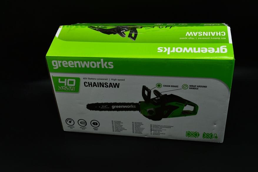 Greenworks GD40CS15 поставляется в относительно небольшой картонной коробке, выполненной в фирменной цветовой гамме компании Greenworks. Коробка информативная, содержит изображение устройства, сведения о производителе и информацию о основных технических характеристиках.
