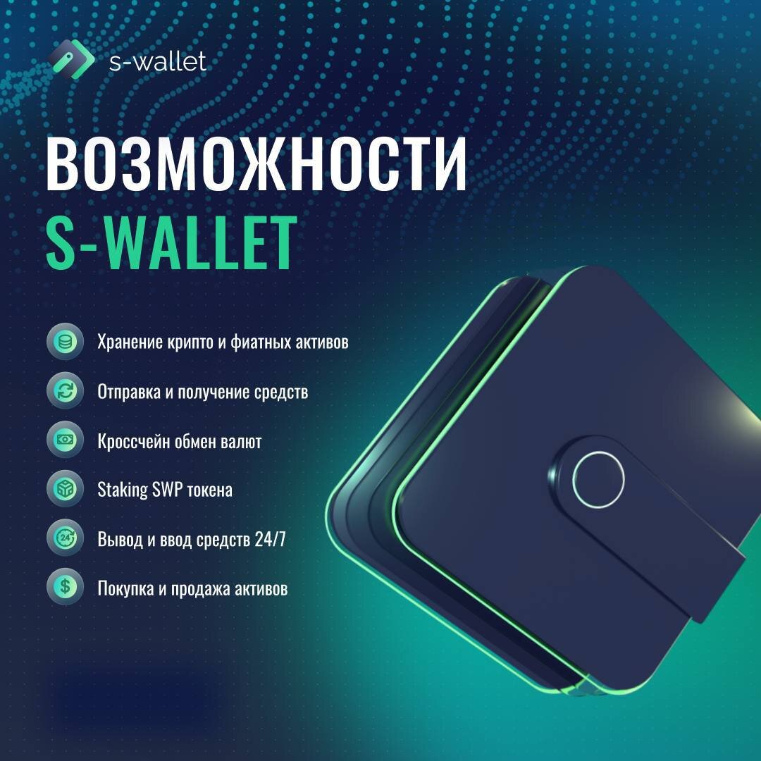 Возможности S-Wallet Базовый функционал S-Wallet включает все, необходимые пользователям возможности: ✔️ Хранение крипто и фиатных активов ✔️ Отправка и получение средств как в сети S-Wallet, так и с других источников ✔️ Кроссчейн обмен валют ✔️ Staking SWP токена ✔️ Вывод и ввод средств 24/7 ✔️ Покупка и продажа активов в несколько кликов Команда проекта активно продолжает разрабатывать новый функционал, который делает экосистему S-Wallet технологичной и удобной 🙌 Рассмотрим одну функцию более детально, такую как стейкинг. Чтобы присоединиться к SWP Steaking Program и получать до 80% годового дохода, необходимо пополнить свой счет SWP и создать депозит для стейкинга в новом разделе. 1. Для начала надо авторизоваться в личном кабинете 2. Затем перейдите в меню и выберите «Операции» -> «Стейкинг» 3. Выберите период, на который будут заблокированы ваши средства. 4. Укажите количество токенов (min 200 - max 50000). 5. Н