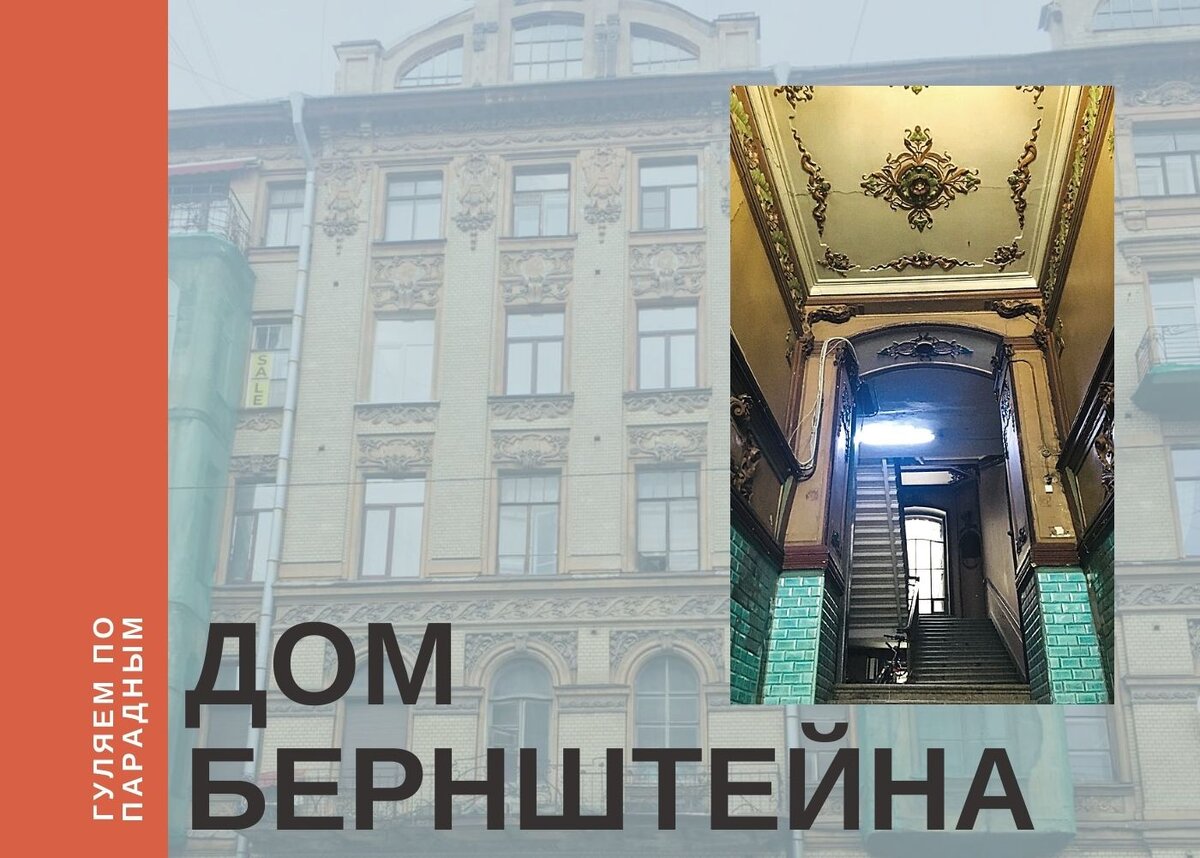 Этот исторический дом с двумя эркерами на три этажа сразу обращает на себя внимание. Хочется стоять и разглядывать красиво оформленный фасад. В качестве облицовки здесь использован светло-бежевый глазурованный кирпич. На нём эффектно выделяется богатый лепной декор с растительными мотивами, в которых сразу угадывается стиль модерн. Доходный дом Григория Бернштейна привлекает внимание не только внешними достоинствами, но и размерами. Он занимает большой участок между 2-й и 3-й Советскими улицами (в прошлом – Рождественскими). Парадная, о которой пойдёт речь, находится по адресу: #2-я Советская ул., 10 Б. Здесь, в подвале дома, находилась контора акционерного общества «Строитель», директором которого был сам домовладелец Григорий Абрамович Бернштейн. Давно хотела попасть в этот дом. Стою на пороге, но вопреки ожиданиям, парадная оказалась закрытой. Благо, долго стоять не пришлось. Кто-то из жильцов вышел – и я придержала дверь. Зашла – и обомлела. Очень пожалела, что была одна, что не с