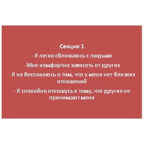 Каждая секция представляет один из четырех типов привязанности. Если одинаковое количество характеристик отмечено в нескольких секциях вы обладаете несколькими типами привязанностей. . . . . .