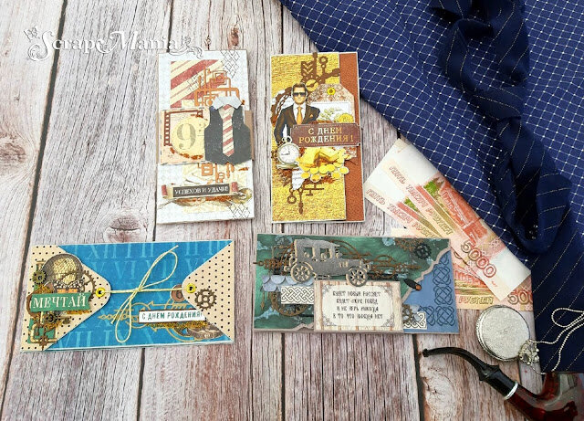 Здравствуйте! Всем кто любит скрапбукинг-привет! Сегодня с вами Рамзиля. И я хочу показать, как использую остатки бумаги от моих проектов - делаю из нах разные открытка и конверты. Сегодня представляю вашему вниманию четыре конверта, которые я сделала из разных коллекций: "Мужчина на миллион","Волшебник", "Вечные странники" и "Викинги". За основу беру разноцветный картон. Конверты разных конструкций, размеры 17х8.5см. Первый конверт. "С днем рождения". Оформление вертикальное. Фон из бумаги "Мужчина на миллион. Офис"и композиция высечки из набора "Мужчина на миллион". Разворот в конверте держится при помощи магнитов. Внутри использовала бумагу "Мужчина на миллион.Библиотека" Второй конверт: "Мечтай и с днем рождения". Оформление горизонтальное. Конверт крепится при помощи шнура. Использовала бумаги "Вечные странники.Фрагменты" и "Вечные странники.Кнопки Машинистки". В оформлении использовала железные шестеренки, ключи и микробисер. Третий конверт "Успехов и удачи". Оформление в