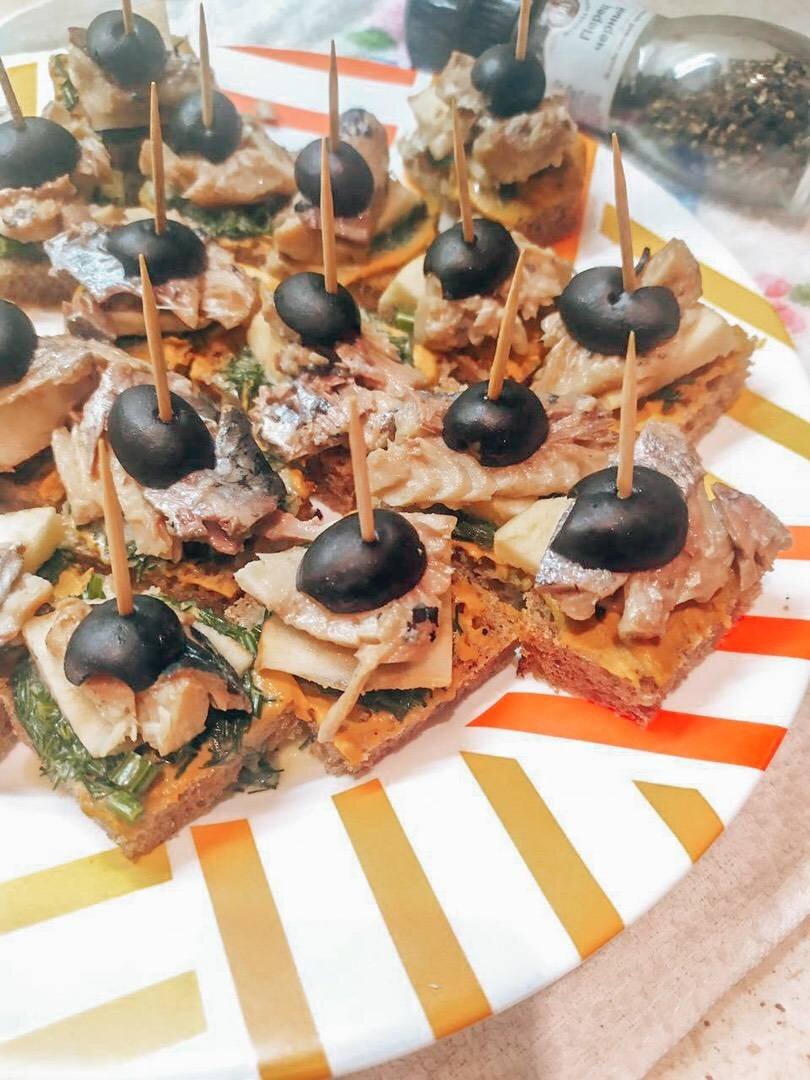 Канапе с селедкой и чёрным хлебом на шпажках- отличный вариант быстрой и эффектной закуски, которую легко готовить и вкусно есть. Из минимального набора продуктов к вас получается большая тарелка минибутербродов, которая украсит любой стол. #канапе #канапессельдью #канапесселедкой #канапенашпажках #традиции #Минск Ингредиенты: чёрного хлеба (4 кусочка), селедки, яблока, горчицы, сливочного масла, укропа, маслин Способ приготовления: Подготовьте необходимые ингредиенты. Масло выньте из холодильника заранее, оно должно стать мягким. С хлеба удалите корочки и нарежьте его на квадратики. Намажьте хлебные квадратики тонким слоем горчицы. Укроп помойте и обсушите, мелко порубите. Добавьте укроп в сливочное масло и перемешайте. Намажьте маслом хлебные квадратики. Яблоко очистите и нарежьте тонкими ломтиками размером с хлеб, уложите их поверх масла. Сверху выложите кусочки селедки. Воткните в каждую канапе шпажку или зубочистку с половинкой маслины. Готово.