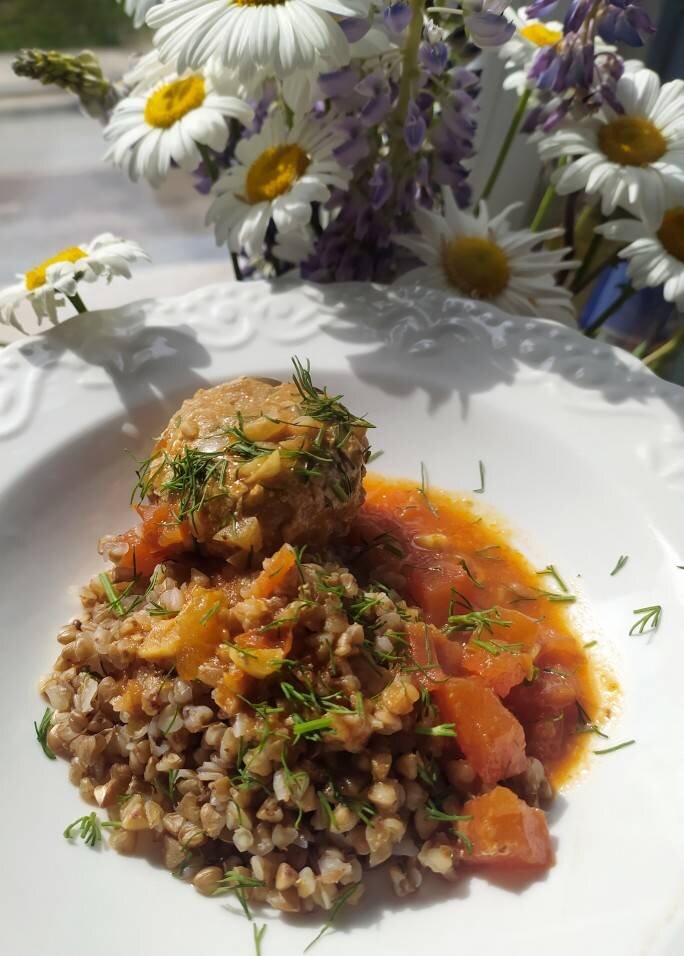 Нежные котлетки придутся по вкусу всем #горячееблюдо #котлеты #Вильнюс Ингредиенты: гр фарша индейки, крупная луковица, желток, манной крупы, Соль, перец, мускатный орех, молотая сушёная паприка, крупный зубчик чеснока, крупный помидор, морковь, помидорное пасты Способ приготовления: В фарш измельчить половину луковицы. Добавить желток и манную крупу. Всыпать соль, перец и мускатный орех. Все тщательно перемешать и дать постоять минут 20, чтобы крупа набухла. Слегка обжарить котлетки. Пару минут, чтобы сформировалась корочка. Снять котлетки на тарелку, а на образовавшемся соке-бульоне обжарить оставшуюся половину луковицы и морковь. Добавить нарезанный помидор, помидорную пасту и влить немного воды. Посолить, поперчить и добавить молотой паприки. Вернуть котлеты в сковороду и накрыть крышкой. Тушить примерно 30 мин.