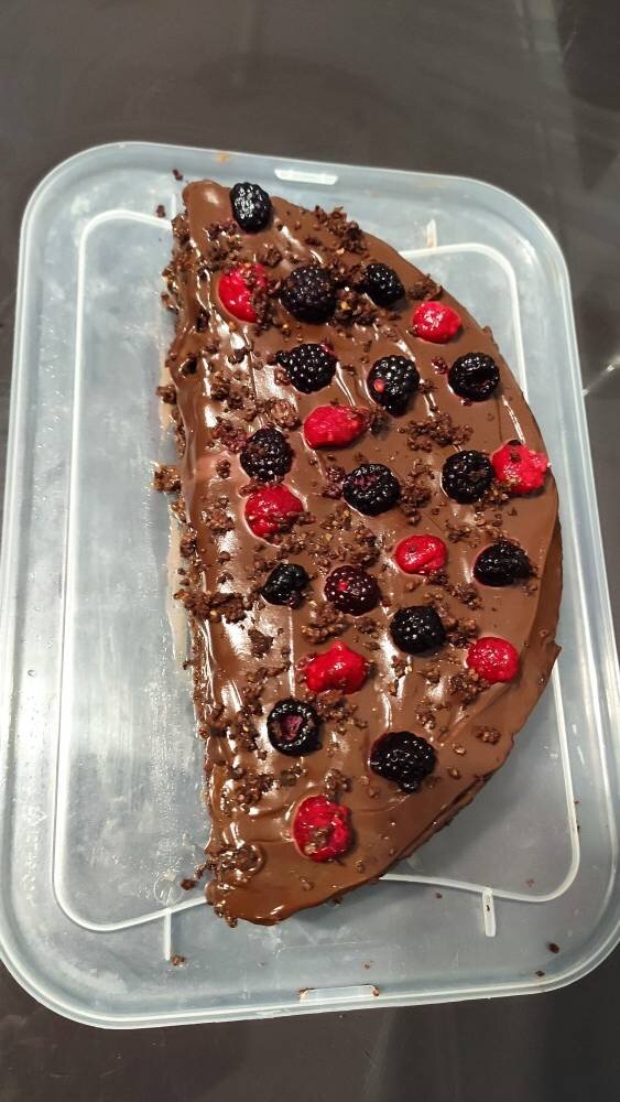 Захотела как-то любимая вкусненького чего-то покушать и увидела шоколадный брауни, чуточку модернизации и шоколадный брауни готов. Калорийность Б-8,7, Ж-13,6, У-16,4, Ккалл -234,6 Ингредиенты: Для теста, какао, Отруби овсяные, сметаны 15%, соды, сах.зама, Для шоколадный ганаш, сливок, шоколада без сахара Способ приготовления: Выкладываем все ингредиенты для теста в удобную миску, всё перемешиваем до однородной массы и получается тесто для выпечки коржа. Смазываем дно мультиварке сливочным маслом распределяем равномерно шоколадную массу для коржа почаще и ставим на режим выпечки, который в моей мультиварке занимает 40 минут. Полученный корж разрезал вдоль и поперёк, получилось четыре маленьких коржика в виде половины основного коржа и оставил остывать. Далее принимаемся за приготовление шоколада. Мелко ломаем плитку шоколада в ковшик и добавляем сливки. Ставим на медленный огонь варится шоколадную массу и как закипит сразу снимаем с огня по желанию можно добавить при варке немного сливо