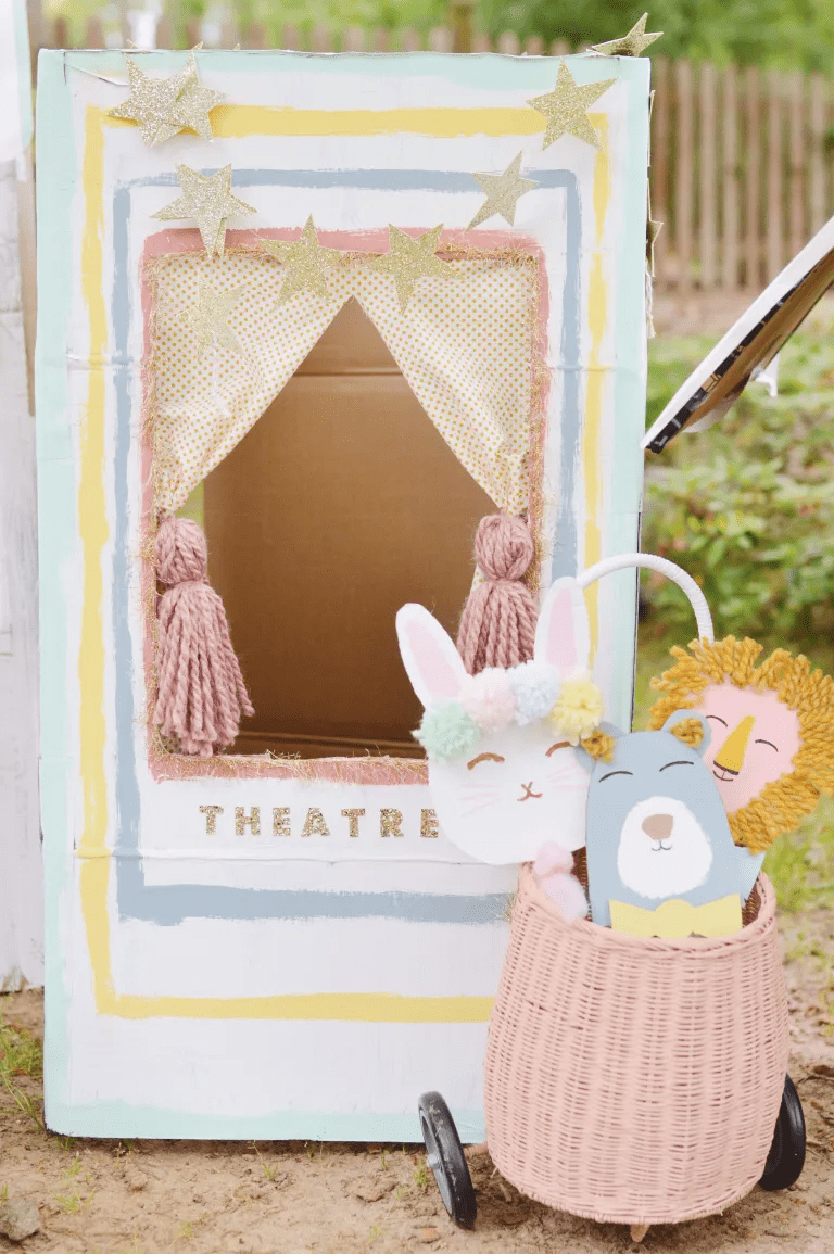 Некоторые впечатляющие декорации на самом деле легко сделать самим! Как и этот театр, а для его изготовления вам понадобится: Сделать саму конструкцию довольно просто. Поставьте коробку на бок, а сзади прорежьте створки (в боковой цельной части). Обязательно заклейте верх и низ коробки, чтобы она не открывалась (скотчем изнутри, тк на него не ляжет краска). Используйте канцелярский нож или ножницы, чтобы вырезать отверстие спереди (это вторая боковинка). Нарисуйте контур, а затем прорежьте его ножом. Кстати, самое важное, чтобы в коробку мог поместиться ребенок! Затем наступает самое интересное — украшение! В данном случае коробку покрасили белым, затем нарисовали узоры, добавили приклеенные изнутри шторы (нужны ткань и пряжа), а сверху протянули гирлянду. А теперь делаем кукол! Берем: Делать очень просто! Обведите тарелочку или что-то круглое на картоне, чтобы получить мордашку. Затем добавьте ушки уже от руки. Мордочку красим и добавляем глазки, носик, рот. Сзади приклейте палочку и