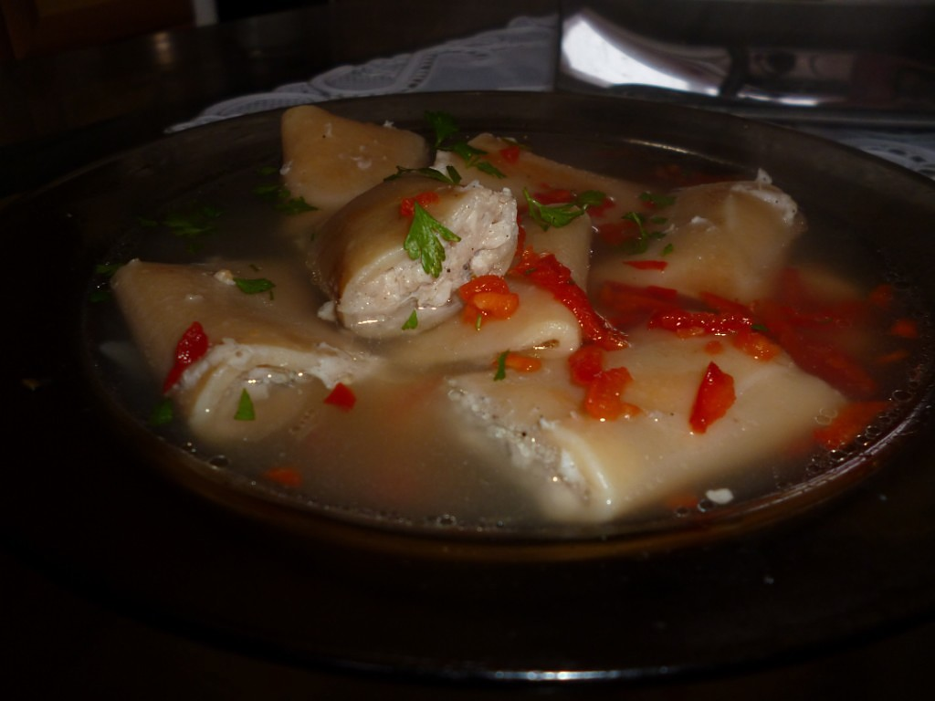 Ингредиенты: макаронные изделия( трубочка)-500 г; фарш куриный-500 г;бульон говяжий- 3 л ;соль, специи- по вкусу; чеснок-3 зубчика; картофель-3 шт; морковь-1 шт; перец болгарский-1 шт;лук репчатый- 1 головка; укроп, петрушка- по 1 столовой ложке. Готовим говяжий бульон, мясо удаляем, добавляем в бульон картофель, порезанный кубиками, даем закипеть и варим на медленном огне 15 мин.