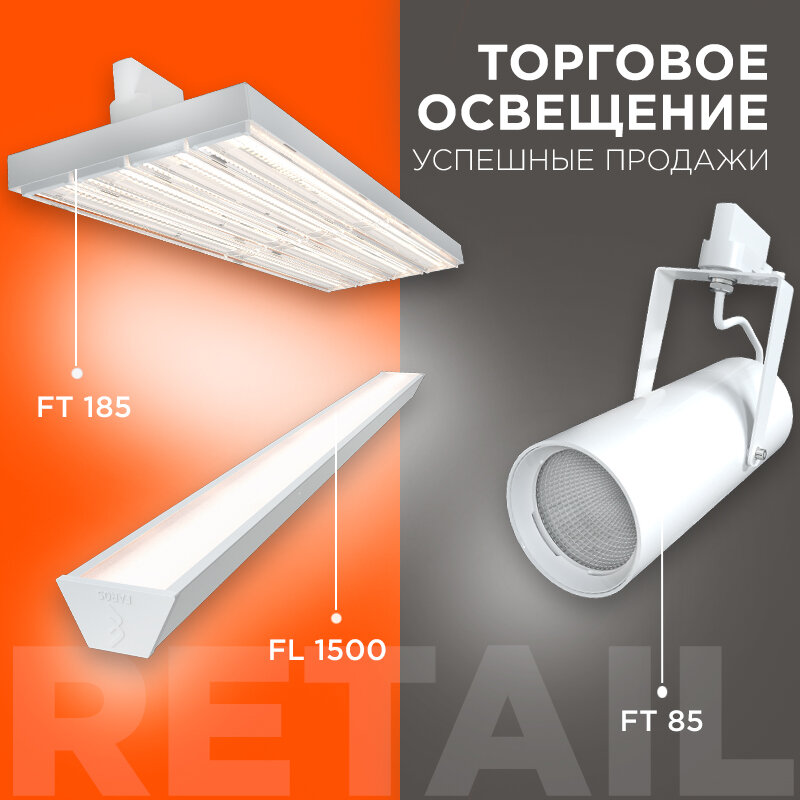 Освещение магазина не должно искажать естественные цвета товаров, поэтому при подборе светильников для торгового зала крайне важно учитывать такой показатель, как цветовая температура, которая варьируется от 2400К до 6600К, в зависимости от конкретных особенностей товара. ТРЕБОВАНИЯ К ОСВЕЩЕННОСТИ, лк Корректность выбора светильников для торговых залов зависит от зоны, в которой они будут расположены. ВХОДНАЯ ЗОНА. Это пространство перед входом в торговый зал, в этой зоне потребитель начинает сосредотачиваться на предстоящих покупках. Подходящие светильники ассортимента FAROS LED: ВИТРИННОЕ ОСВЕЩЕНИЕ. Витрины смело можно считат