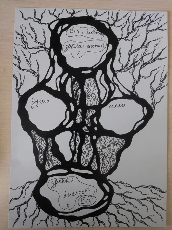 1. Возьмите альбомный лист и черный маркер средней толщины. 2. Обозначьте тему, с которой хотите поработать. Это должна быть тема, связанная с гармонизацией и связью с Богом. Можно так и написать. Точную формулировку можете взять из названия МК. 3. Расположите лист вертикально. Нарисуйте вверху листа круг, ниже посередине два круга, внизу один круг. Как на рисунке. 4. Подпишите круги: верхний - Бог, левый - душа, правый - тело, нижний - я, зрелая личность. Остальное пока не пишите. 5. Проведите линии в следующих направлениях: а) от Бога к душе и от души к Богу, б) от Бога к телу и от тела к Богу, в) от души к телу и от тела к душе, г) от души к зрелой личности и от зрелой личности к душе, д) от тела к зрелой личности и от зрелой личности к телу, е) от Бога к зрелой личности и от зрелой личности к Богу, (должны получиться двусторонние отношения во всех направлениях. 6. Обведите все круги и линии нейрографической линией. Если вы еще не знаете, что такое нейрографическая линия, то посмотр