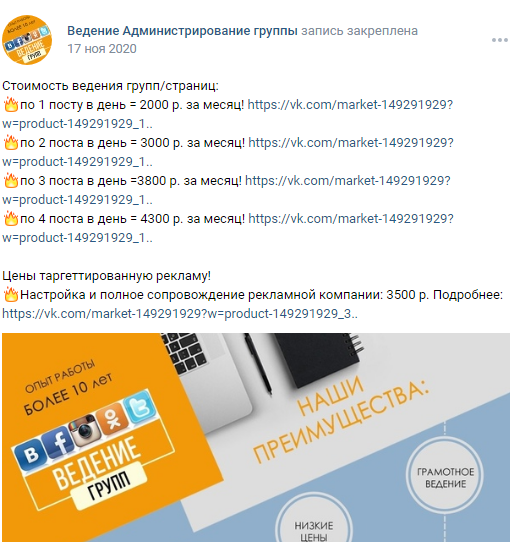В предыдущей статье агентство продвижения предлагало аж 8 тысяч за сложный контент при загрузке минимум 12 постов в день, но сколько же стоит найти адекватного контент-менеджера на удаленку? Самое дешевое предложение, которое я нашла на картинке ниже: Если вам требуется 1-2 поста в день и необходимо поддерживать группу в рабочем состоянии, то бюджет в 2000-3000 руб. более чем оптимален, при этом вам даже проведут простой анализ ЦА и будут заниматься легкой модерацией сообщества, удаляя лишний спам и нецензурные комментарии. Конечно таргетинг и оформление группы уже за отдельную плату. Бюджетно? Ну ооочень. Но, если речь идет об увеличении количества подписчиков, роста продаж с данной группы, то подход нужен совершенно иной. Вот вариант ведения под ключ от официального агентства: Хотя после цен "Пряника" уже одолевают сомнения касательно соотношения цена-качество. В первом кейсе запланировано всего лишь 8 постов за месяц. Мало? Маловато на мой взгляд. Зато данный вариант подходит для