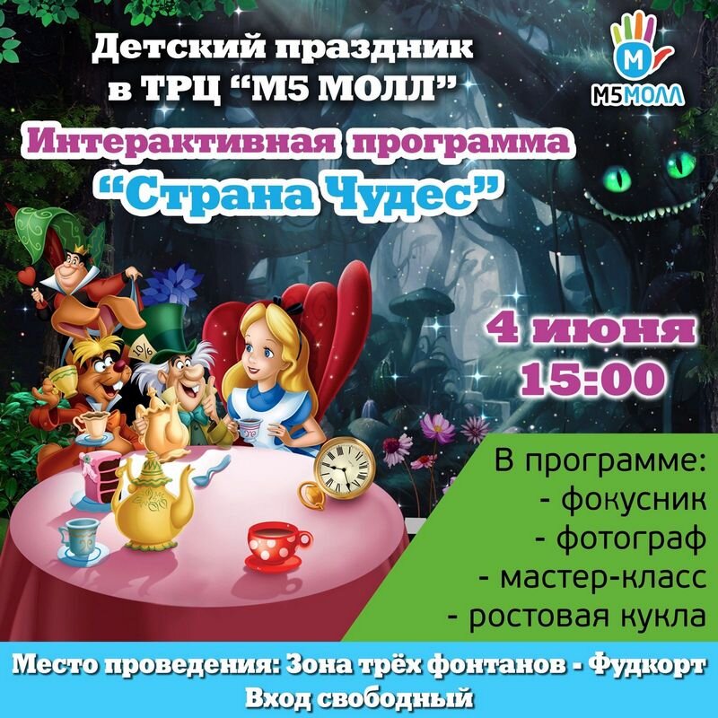 Детская афиша первого летнего месяца в «М5 Молл» стартует 4 июня с необычного и волшебного праздника, ведь его действие пройдет в «Стране чудес». В этот раз проводниками в сказочный мир станут Алиса и Шляпник – герои книги Льюиса Кэрролла «Приключение Алисы в Стране чудес». Юные гости вместе с героями побывают в сказочном Зазеркалье, где им предстоит проявить смекалку и совершить много интересных открытий: дети научатся играть в крокет и танцевать знаменитый танец Шляпника «джигу-дрыгу», а также создадут пушистых и ярких фламинго на творческом занятии. И, конечно, самым интересным, зрелищным и волшебным будет выступление фокусника, ведь в молловской «Стране чудес» живут настоящие волшебники. На празднике будет работать фотограф, который бесплатно сделает снимки на память о посещении сказочной страны. Детский праздник «Страна чудес» пройдет в ТРЦ «М5 Молл» 4 июня. Начало в 15:00. Место проведения: зона Трёх фонтанов (фудкорт). ВХОД СВОБОДНЫЙ. Возрастное ограничение: 3+