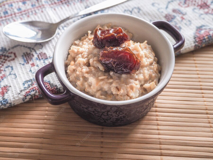 Для данного завтрака Вам понадобится всего три ингредиента и всего 2 минуты Вашего драгоценного времени. Берем чашку, нарезаем мелко 4 или 5 фиников. Я иногда добавляю даже больше, потом что я еще та сладкоежка)))) Далее насыпаем 50 грамм овсянки и заливаем все это кипяченной водой. Потом размешиваем и в микроволновку на 1.5 мин. И ВСЕ! Самый простой и самый вкуснейший завтрак готов! По вкусу можете добавлять молоко вместо воды, очень подходит овсяное, но и с любым другим будет вкусно. Так же можете добавить немного сливочного масла или арахисовой пасты. Можно добавить любой урбеч, ягоды, орешки. Финики очень хорошо сочетаются по вкусу с грецким орехом. Приятного аппетита, котики!
