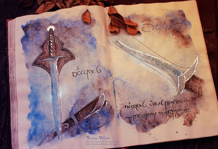 Далеко не всякому именитому оружию (вне зависимости от того кем и когда оно было выковано) довелось обрести историю и судьбу равную "кинжалу в кожаном чехле"**, унесенному Бильбо Бэггинсом из пещеры троллей. Было ли дано имя этому эльфийскому ножу (это для хоббита он мог служить мечом, для эльфа же вряд ли)))) нам не известно. Имя свое кинжал заслужил, можно сказать, сам😁 Итак, Жало! Кинжал Бильбо также светился в темноте при приближении гоблинов (орков), что позволяет нам предположить его изначально милитаристское предназначение. Свечение это позволило Бильбо ориентироваться в кромешной темноте подземных лабиринтов, а сам кинжал до поры уберегал хоббита от острых зубов Голлума. Но Жалом оружие стало позднее, когда мистеру Бэггинсу удалось: "убить гигантского паука в темноте, в одиночку, без помощи волшебника, гномов или кого бы то ни было... Он вытер кинжал о траву и вложил в ножны. — Отныне я буду называть тебя Жалом, — сказал он клинку."** "Ух! У него Жало!" - свистели, брызгая с
