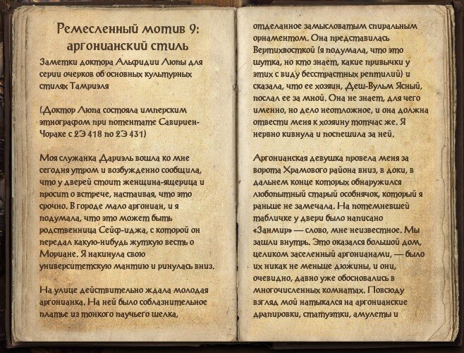 Аргонианская девушка провела меня за ворота Храмового района вниз, в доки, в дальнем конце которых обнаружился любопытный старый особнячок, который я раньше не замечала. На потемневшей табличке у двери было написано "Занмир" - слово мне неизвестное. Мы зашли внутрь. Это оказался большой дом, целиком заселенный аргонианами, - было никак не меньше дюжины, и они, очевидно, давно уже обосновались в многочисленных комнатах. Повсюду взгляд мой натыкался на аргонианские драпировки, статуэтки, амулеты и всяческие поделки, сделанные из таких натуральных материалов, как кость, перья, раковины, и украшенные яркими спиральными и геометрическими орнаментами. Если эти предметы обихода привычны в домах аргониан на их родине, значит, змеиная кожа, черепаховые панцири, зазубренные клыки, бирюза и нефрит - все, что мы считаем экзотическими материалами, - должны встречаться в Чернотопье повсеместно.