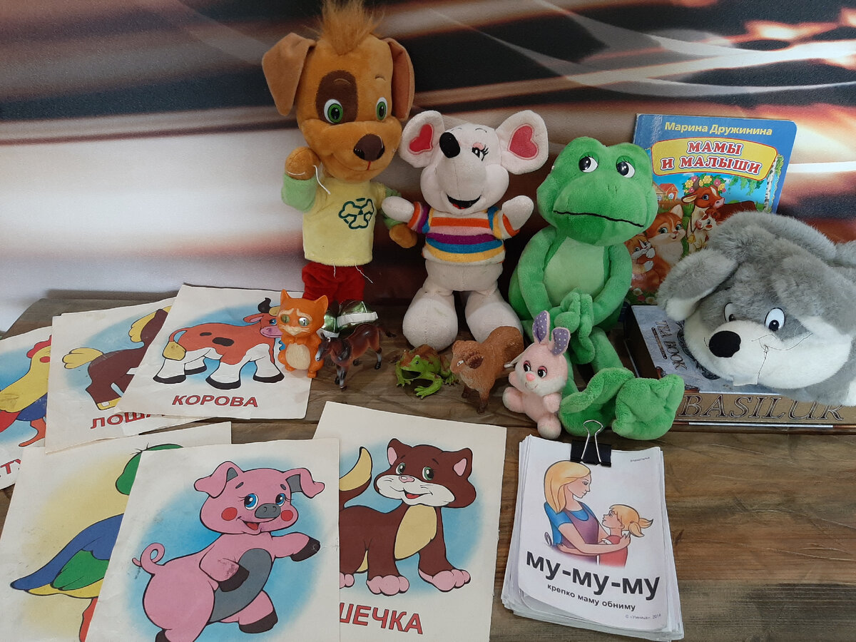 План занятия "Лексическая тема-домашние животные": 1. Сортер "Морковки". Кормим кролика морковкой, вызывая звукоподражание "Ам", повторяем слова "На", "Тут" 2. Сортер "Матрешка" ( работа над мелкой моторикой+ повторение слов "Да/Нет) 3. Рассказ стихотворений о животных М.Дружининой "Мама и малыши" с последующим определением "Большой и маленький" 4. Работа с карточками-бормоталками, слоги с согласными: М, П, Б, Н. 5. Обыгрывание "Сказки о глупом мышонке" + введение глагола "Иди" Ход занятия: 1. Сортер "Морковки". Кормим кролика морковкой, вызывая звукоподражание "Ам", повторяем слова "На", "Тут". Для данного задания потребуется сортер с различными по размеру морковками, мягкая игрушка или фигурка кролика. Задача: для начала мы показываем животное и спрашиваем "Кто это? Это кролик. Как кролик прыгает? Оп оп оп". Спрашиваем у ребенка, а что любит кролик кушать? "Мо мо морковку. Да. Он голодный. Покормишь его?" Ждем ответа от ребенка и потом достаем сортер. Показываем морковку и говорим р