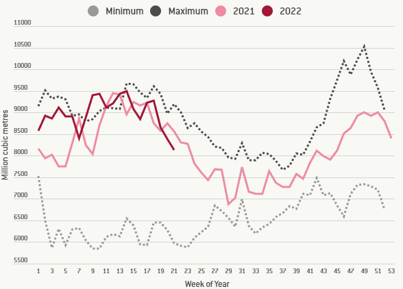 "Газпром" отчитался о производственных итогах первых пяти месяцев 2022 года. Добыча 211,4 млрд куб. м (на 4,8% меньше прошлогоднего показателя). В целом это соответствует показателю 2019-го, который продемонстрировал лучший на тот момент результат с 2012 года. Сильнее всего просел экспорт в страны дальнего зарубежья - на 27,6% (до 61 млрд куб. м) по сравнению с аналогичным периодом прошлого года. Тут есть три тонкости. Прежде чем обозначить их, предлагаю посмотреть на графики, которые составляет Bruege. Это импорт газа ЕС. В наибольшей степени европейцы снизили закупки из России. А теперь тонкости. Первая: с января по март на фоне резко возросших котировок (аномальные даже для мирового кризиса скачки начались в декабре 2021 года) на 79% увеличился приток СПГ в Европу. Вторая: спрос на газ в ряде секторов снижался. По существующим оценкам, суммарное падение в первом квартале составило около 7% по сравнению с аналогичным периодом прошлого года. Сильнее всего просели промышленники, на до