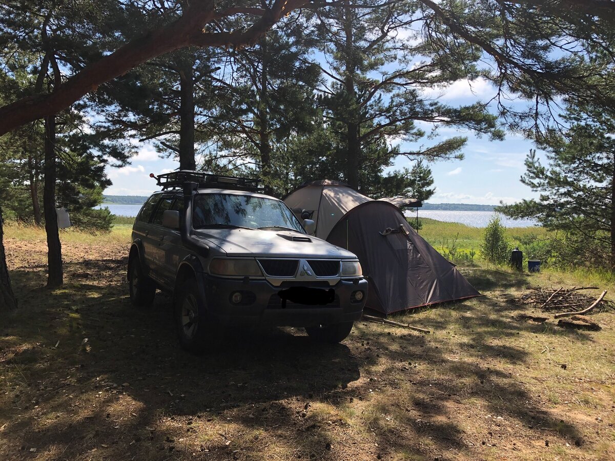 - Тент. Докуплен был на следующий год. Незаменимая вещь на юге, да и на севере. Защищает палатку от дождя, падающих иголок и солнца. Увеличивает площадь для отдыха. Тентом можно организовать переход из палатки на кухню или до машины. Вариаций море. У нас тент Outventure Tarp.