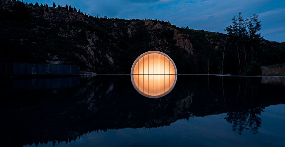 Вот не думал я, что такое когда-нибудь напишу про китайскую архитектуру, но тем не менее. Этот китайский проект поражает прежде всего простотой и лаконичностью форм, здание является буквально продолжением природного ландшафта с одной стороны, а с другой привносит в окружающее пространство элемент сказочности. Ведь обычно китайцы хотят поразить размерами, формой, декором, показать величие заказчика, а тут все вообще не так. Наше сегодняшнее здание - зал бракосочетаний The Hometown Moon, построено в 2021 году по проекту архитектурного бюро SYN Architects, расположен в Тайань, Китай. Как легко понять их названия, основной фишкой здания является световой фонарь, выполненный в форме сферы, а благодаря бассейну на крыше здания и хитрой подсветке, издалека зал выглядит, как заходящая Луна. Для понимания устройства зала бракосочетаний есть схема. В светлое время суток зал освещается за счёт рассеянного света, проходящего через полусферу на крыше здания, а вечером уже сама сфера становится
