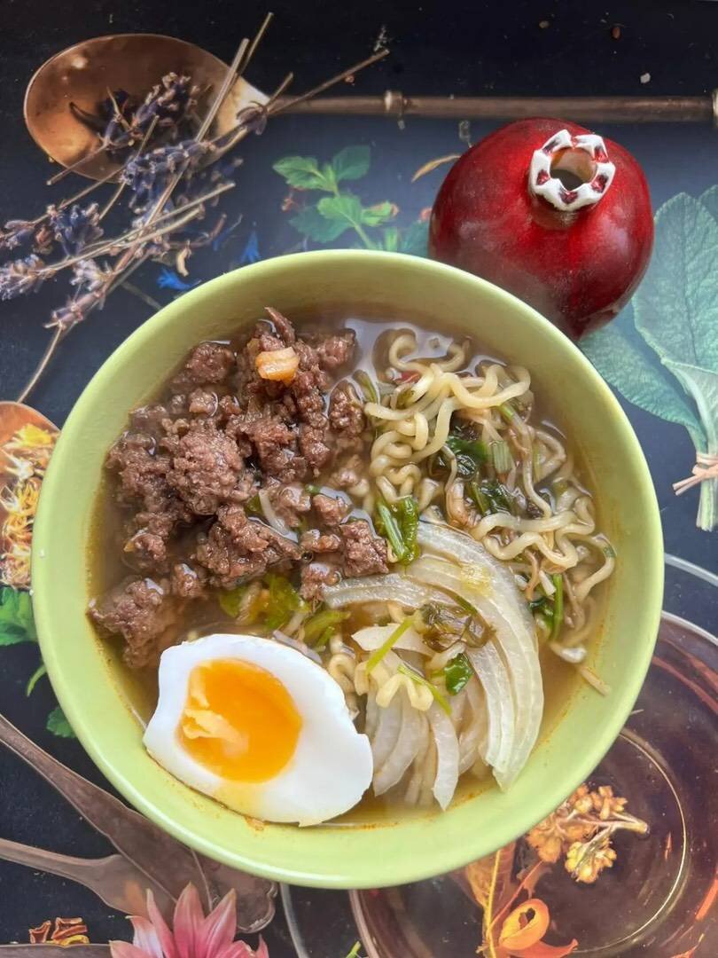 Ингредиенты: Лапша для рамен , Пророщенные ростки (у меня маша-50-100 гр- проращиваю сама), Кинза , рыбного соуса, соевого соуса, устричного соуса, чеснока, кунжутного масла, фарша (у меня говяжий), Лук, Яйца отв. Способ приготовления: На кунжутном масле обжарить быстро нарезанный чеснок, добавить фарш и быстро обжарить до готовности, при постоянном помешивании. Добавить 1 ст л соевого соуса. Отложить. В кастрюлю заливаем воду, даём закипеть, добавляем соевый, рыбный соус и лапшу, варим до готовности добавляем ростки и кинзу и тут же выключаем (можно выкладывать свежие ростки и кинзу в готовый суп в тарелку). Накладываем рамен миску, выкладываем перья лука, обжаренный фарш,яйцо. Приятного аппетита
