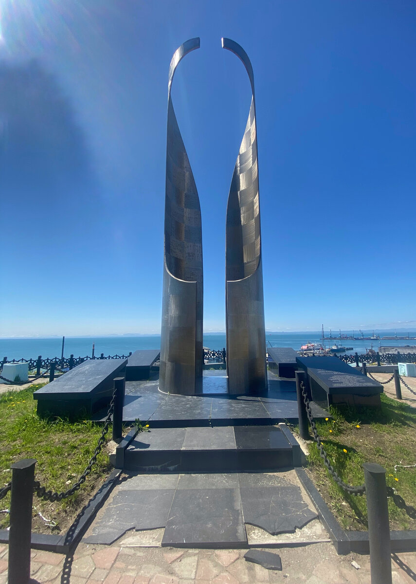 В Корсакове есть интересный памятник, в народе его называют «Гора Грусти/Печали», а сам мемориал – «Слеза». Его официальное название – «Интернированным японцами на Сахалин корейцам, так и не вернувшимся на родину».