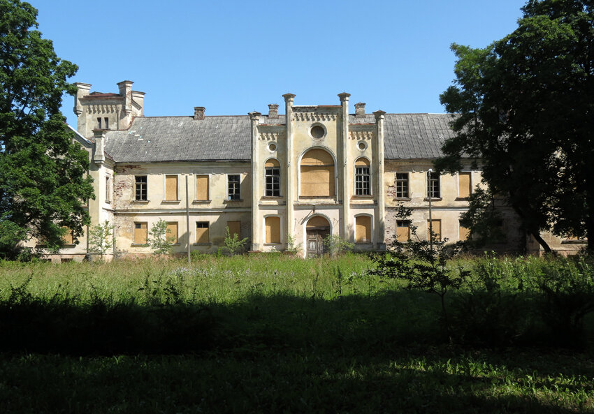 Цирава - крупное село в Латвии где-то в 30км от Лиепаи и в 20 по кратчайшей прямой от Балтийского моря, практически на въезде в которое мы оказались в старой, заросшей усадьбе: Здесь когда-то стоял замок Цирау, которым владели рыцари-вассалы Курляндского епископа - но от него не осталось даже следа. Нынешний дворец известен с 1752 года как охотничье поместье баронов Мантейфель. Неоготический облик - 1870-х годов: В 1922 году в усадьбе открылась лесная школа, в 1957 её сменил сельхозтехникум, а в 1990-х замок был приватизирован. Ныне он хоть и в печальном состоянии, но не совсем бесхозен, а просто выставлен на продажу: так что если у кого завалялся лишний миллион евро и мечта жить во дворце - обращайтесь в Danske Bank. В усадебном парке - конюшня с налётом русского классицизма: И дом прислуги, размером немногим уступающий дворцу: Вообще же парк занимает около 30 гектар, но мы как водится не углублялись: За мельничным прудом - собственно посёлок, центральная его часть напоминает скорее н