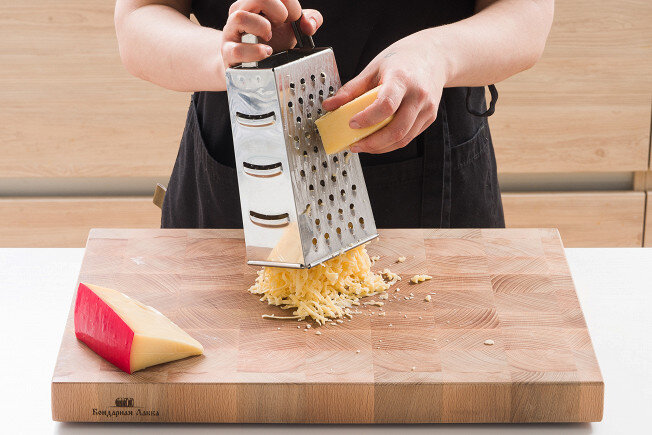 Натрите 300 грамм сыра на средней терке. Лучше брать смесь сыров, чтобы вкус соуса получился интереснее. Мы использовали 150 грамм чеддера и 150 грамм гауды. Во-первых, они отлично сочетаются между собой. Во-вторых, именно пряный чеддер используется в оригинальной английской версии сырного соуса. Если настойчивый и узнаваемый вкус чеддера вам не нравится, вы можете поменять его на любой другой. Но все же мы советуем для сырного соуса обязательно добавлять сыры яркие и зрелые, например, грюйер или пармезан. Из мягких сыров идеально для этих целей идеально подходит дор блю.