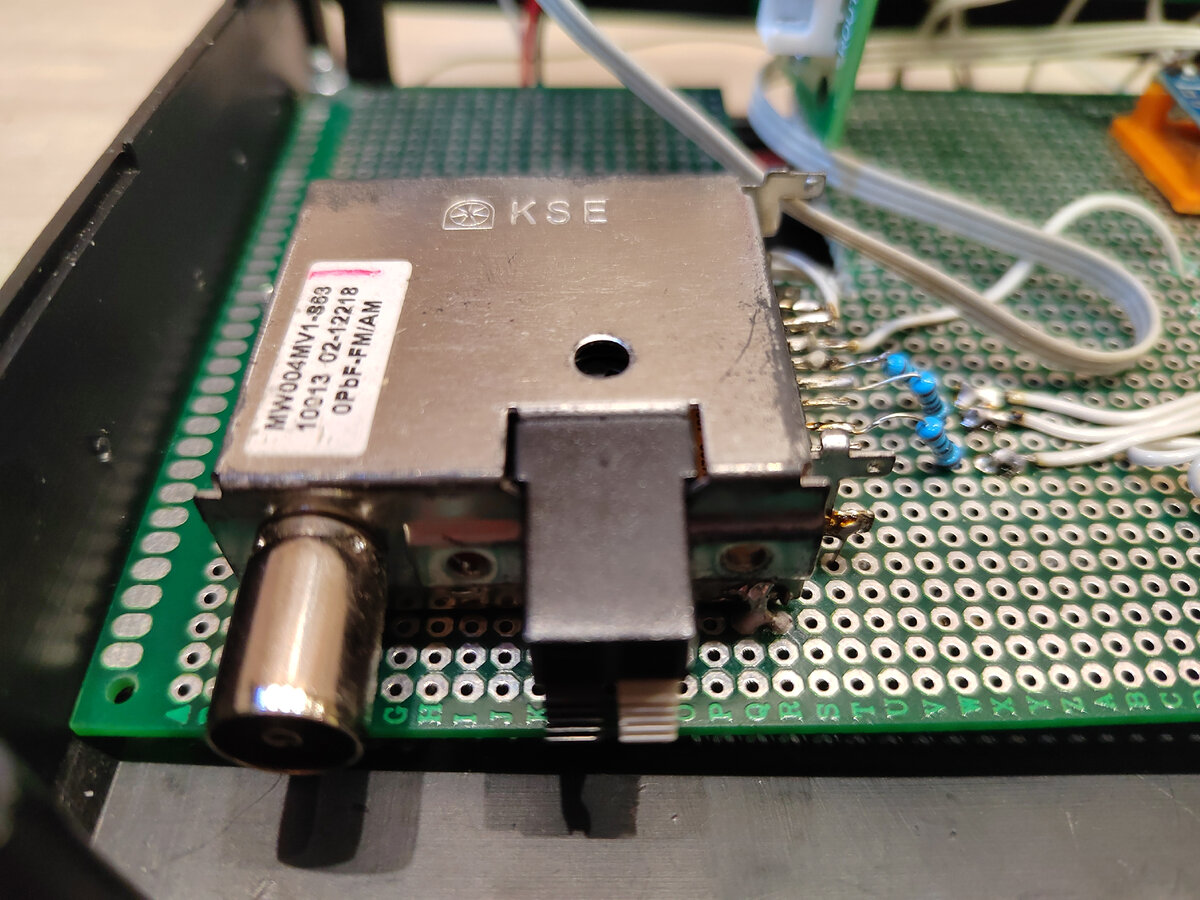 Сегодня на работе выдался выходной и я приступил к продолжению сборки самодельного радиоприемника. Написание программы для контроллера, который будет этим приёмником управлять, я решил оставить для другого раза. Сегодня только монтаж. Радио модуль выполнен в моем приемнике в виде готового блока. Микросхема установлена на плате и заключена в металлическую коробочку. С одной стороны выводы для подключения усилителя и управления, с другой антенные гнезда. Антенны УКВ и КВ подключаются отдельно. Я просто припаял этот блок на монтажку. Тут возник вопрос, как к нему подключать контроллер. Напрямую или нет? В интернете, в большинстве случаев советуют подключать через резисторы. Я тоже решил не рисковать и припаял на каждый вывод управления по резистору в сто ом. Паяю я не очень удачно, но да ладно. Теперь вопрос как подключать усилитель звука? У приемника два выхода, то есть стерео, у усилителя два канала, тоже стерео. А динамик то у меня один! Может просто перемкнуть левый и правый канал