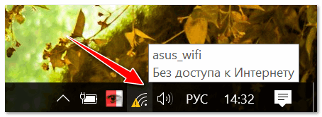 Пример ошибки: при наведении на значок Wi-Fi, Windows сообщает, что соединение без доступа к интернету...