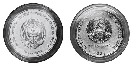 8 сентября 1992 года Верховный Совет ПМР издал постановление об образовании Министерства государственной безопасности. 1 июня 2022 года в обращение вводятся памятные монеты из недрагоценных металлов достоинством 25 рублей «30 лет органам государственной безопасности ПМР» серии «Государственность Приднестровья». Номинал: 25 рублей Материал: сталь с покрытием белым никелем Диаметр: 28,65 мм Масса: 9,45 г Гурт: гладкий Тираж: 2 500 штук Навигация: Медная монета // Приднестровье