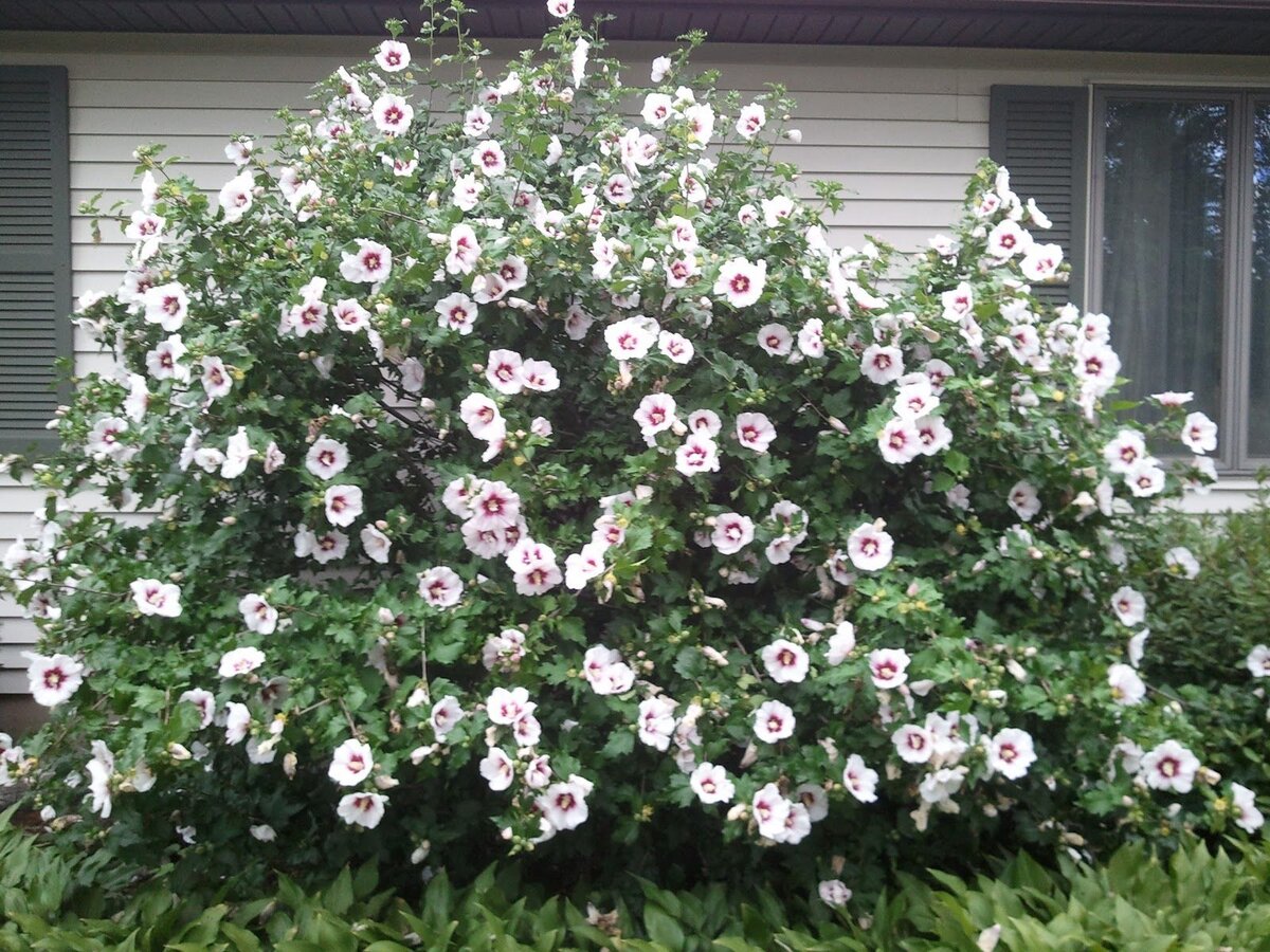 Эти многолетние растения просыпаются намного позже других, но компенсируется эта задержка быстрым ростом и очень красивым цветением. Большая часть из рода этих растений произрастают в тропических районах планеты и нами выращиваются в качестве комнатных растений. Но несколько представителей рода способны переносить морозы, а потому очень популярны у садоводов. Сегодня я хочу рассказать вам о сирийском гибискусе - неприхотливом кустарнике с изумительным цветением. Сирийский гибискус мы чаще называем древовидным, так как он имеет древовидные побеги. Впервые это растение я увидела на Сочинском побережье, была просто поражена размерам кустарника и обилию цветения. В благоприятном климате растение имеет размеры 4-5 метров в высоту и столько же в ширину. В средней полосе России гибискус древовидный редко превышает высоту двух метров, впрочем, размеры его всегда можно поддерживать формирующей стрижкой. Гибискус древовидный растет не очень быстро, несмотря на это вырастить его мечтают многие.