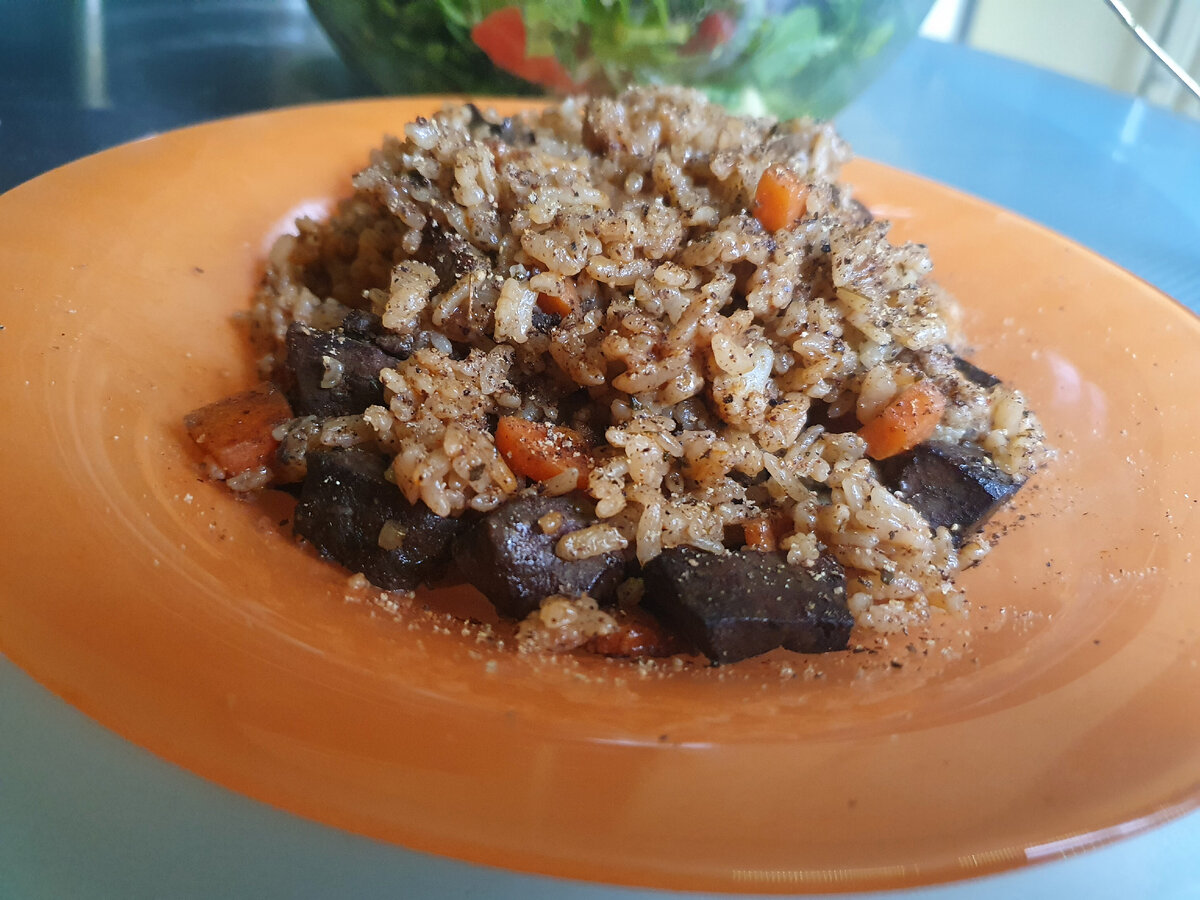 Периодически я развлекаюсь тем, что заменяю какой-нибудь элемент в давно известной рецептуре - получается совершенно другое блюдо. Представляю вашему вниманию результат недавнего моего развлечения - плов. Я поменяла баранину на печень индейки и в связи с этим немного скорректировала набор специй. Состав (как обычно на 2 порции): печень 150г, рис 100г, лук репчатый 1 шт, морковь 1шт, чеснок 1зуб, сушеные паприка, петрушка, укроп, кориандр, базилик, майоран, чабер, шалфей, ч.перец. Рис я взяла специальный, для плова, и на мой взгляд не зря он так называется - идеально подходит для этого блюда. Про другие виды риса и взаимодействие с ними можно почитать у меня тут: Рис заранее тщательно промыть и откинуть на сито для стекания (должен хорошенько подсохнуть). Лук крупно нарубить, зубчик чеснока раздавить плоской стороной ножа. Обжарить овощи в разогретом масле до полупрозрачности. Добавить печень и морковь, нарезанные крупными кубиками, и быстро обжарить на сильном огне, постоянно помешивая