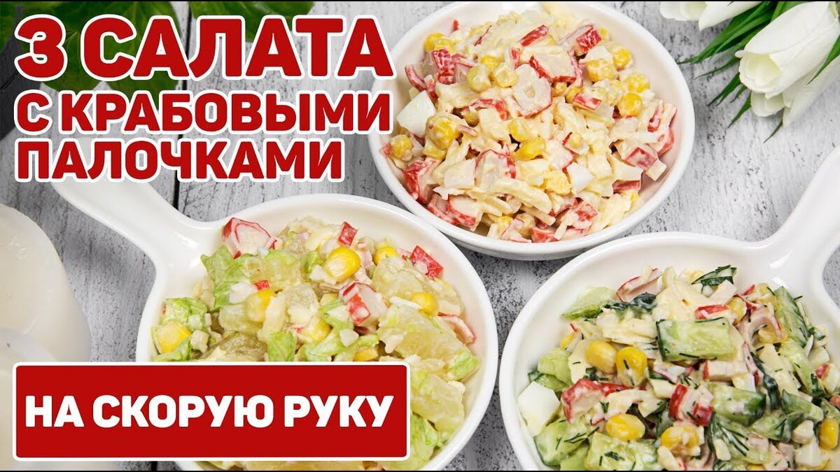 ВИДЕО РЕЦЕПТЫ В КОНЦЕ СТАТЬИ! ✳️ Ингредиенты для салата с крабовыми палочками на скорую руку: - 200гр крабовых палочек - 200гр сыра - 200гр кукурузы - 2 яйца - натуральный йогурт для заправки (либо сметана, мацони или майонез - заправляйте тем, что больше любите) Яйца и крабовые палочки мелко нарезаются, сыр натирается на крупной терке, все ингредиенты смешиваются между собой и добавляется соль по вкусу. На основе этого салата можно сделать его два варианта ✳️ Для варианта №1 понадобится: - 1 огурец - петрушка - зеленый лук Мелко нарезаем огурец, зеленый лук и петрушку. И добавляем к уже готовому салату, при необходимости немного посолив. И у вас отличный летний салат!) ✳️ Для варианта №2 - немного салата айсберг - консервированный ананас кусочками Айсберг мелко режем и вместе с кусочками ананасов добавляем в салат. И получаем новый по вкусу салат!) Праздничный и очень классный!) ВИДЕО РЕЦЕПТЫ: