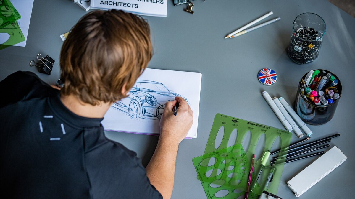 После того как вы получили очертания кузова автомобиля, можно перейти к линии остекления. Она, по сути, представляет собой крышу и окна. Поскольку в линии остекления MINI отсутствуют ярко выраженные стойки, которые обычно есть у других автомобилей, в результате получается затемненный образ, известный как «черная полоса». Затем вам нужно будет поработать над колесами и фарами. Сейчас самое время начать переходить к более темным линиям на вашем эскизе. Переднюю часть MINI отличают характерные круглые фары. Нарисовать овал не так просто, как кажется – особенно если ранее вы не практиковались. «Это сложная задача даже для профессионалов», – говорит Йозеф. Именно поэтому, чтобы работать еще более эффективно, он использует трафареты. «Когда вы вбиваете гвоздь в стену, вы используете молоток. Так почему бы вам не использовать инструменты, когда вы рисуете?». Также трафареты могут оказаться очень полезны при рисовании колес. «На детальную отрисовку шины с ободом может уйти больше времени, чем на весь эскиз, – говорит Йозеф. – Поэтому я сразу рекомендую определить приоритеты. Как правило, в большинстве случаев схематичного наброска вполне достаточно».