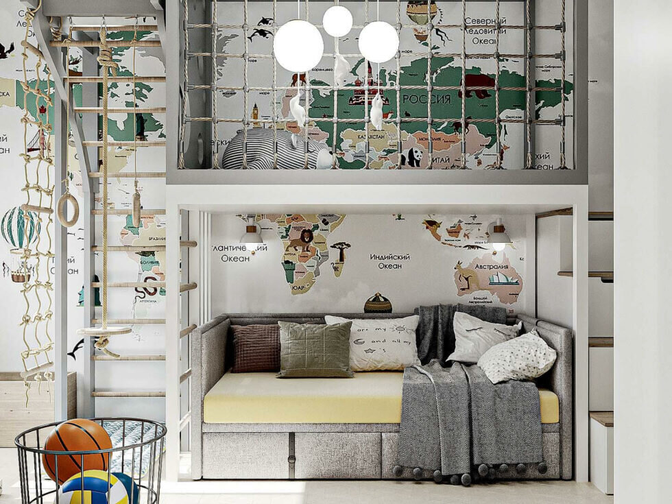 Обустраивая детскую мальчика, нужно уделить внимание мебели. Мы делимся советами о том, как сделать комнату мальчишки яркой, интересной и функциональной. Подробнее здесь Эта необычная двухъярусная кроватка отлично подойдет будущему путешественнику. На первом ярусе расположено удобное спальное место, а второй этаж отведен под игровую зону. Стена рядом с дизайнерской мебелью украшена пестрой картой мира. С ней ребенку будет еще интереснее составлять перед сном новый маршрут к приключениям. Рядом с окном разместился небольшой столик с забавными стульями в виде зверей. Такая мультяшная мебель для мальчика точно не позволит малышу заскучать. Удобно устроившись за столиком, ребенок сможет заняться рисованием, любимыми раскрасками или чтением. Убрать все альбомы и книжки можно будет на оригинальную навесную полочку, которая напоминает лабиринт. Напротив кроватки разместилась удобная система хранения. Эта необычная мебель для детской комнаты сочетает в себе шкаф и комод с вместительными выдвиж