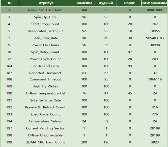 199 UltraDMA CRC Error Count – (3923) отображает количество ошибок, возникших во время передачи данных по кабелю в режиме UltraDMA от контроллера платы до контроллера диска. Рост значения данного параметра в большинстве случаев говорит о плохом качестве шлейфа передачи данных