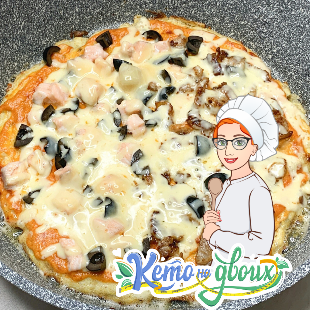 Для теста: Молотый лён 1 ст.л. Яйцо 1 шт Вода 20 мл Растительное масло для жарки (небольшое количество) Начинку можно выбрать любую по вкусу. У нас половина была с рыбой (семга сырая) и маслинами, вторая половина с беконом (предварительно обжаренный) и маслинами. Можно добавить курицу, помидоры, фарш, домашнюю колбасу или покупную, но с хорошим составом. 🧀Сыр 30-40 гр потереть сверху. Лён, яйцо и воду тщательно перемешиваем. На сковороде разогреваем небольшое количество масла, выливаем тесто. Получившийся блинчик жарим пару минут, до момента, когда он немного схватится, и сверху выкладываем любую начинку, подходящую для кето-питания, сверху выложить тертый сыр. Оставляем доготавливаться пиццу на 5-7 минут на сковороде, пока сыр не расплавится. 🍕Пицца готова. Приятного аппетита!