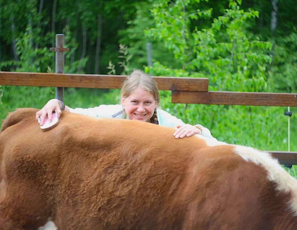 - Да, я опоздала из-за дождя. Надеюсь, он не в обиде… Таков был наш приветственный диалог с хозяйкой быка. Я решила, что после всех массажев с забора, прочитанных ему сказок и съеденных лакомств, он не только пустит меня на свою территорию, но и позволит везде его почесать, стоя рядом. Но это решила я. Что думал бык по этому поводу, я не знала. И мне не терпелось выяснить. Уже пару дней я ходила и не без трепета и гордости повторяла про себя фразу, что бык доверяет моим рукам. Во-первых, это животное, которое при первой встрече не хотело вообще брать еду из моих рук, а из лакомств признавало только хлеб, научилось за неделю есть яблоки, морковь и, кажется, готово теперь пробовать и другие угощения, которые я предложила бы ему. Без предубеждения – просто доверяя, что плохого я не посоветую. Во-вторых, последние