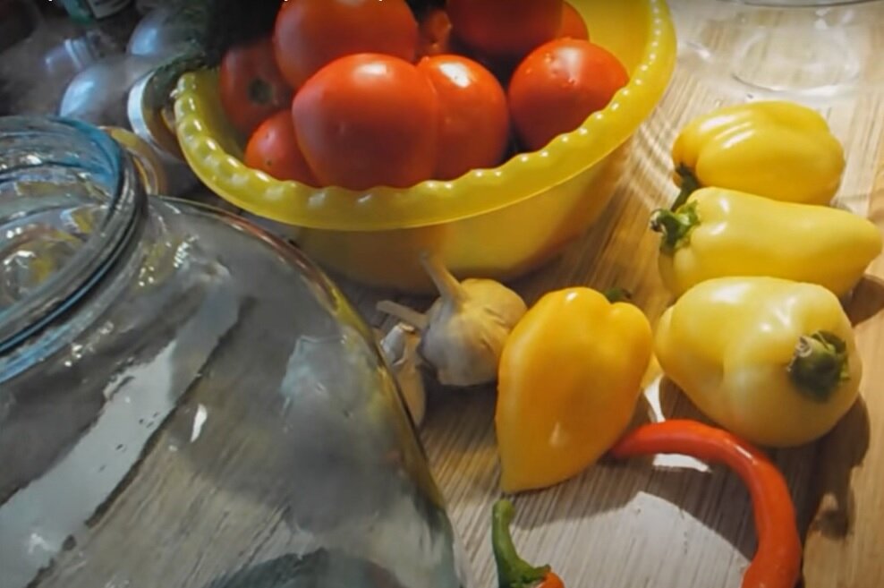 Скоро на наших грядках будут созревать овощи - это прекрасная пора для приготовления вкуснейших помидорок! Замечательная закуска к горячительным напиткам (особенно если и напитки тоже сами готовите ;) это в двойне вкуснее)... Для приготовления нам понадобятся из расчета на один трёх литровый баллон (я всегда делаю по два баллона за раз): Помидорки - 2 кг. (не крупные, желательно сорт сливка, но если нет - это не страшно, я делаю из любых); Болгарский перец - 4 шт.; Чеснок - 2 головки; Горький перец - 1 шт. (кто любит УХХХ... , кладите 2 шт); Зелень на Ваше усмотрение - я кладу только укроп. Для заправки: Уксус - 100 мл. (6%); Растительное масло - 100 мл.; Сахар - 100 гр. Соль - 2 ст.л. И так приступаем к приготовлению вкуснятинки.... Помидоры нарезаем на 2 части (если крупненькие, то на 4 части, предварительно вырезая жопки, хвостики или как там они... Складываем их в баллон. Далее делаем заправку: перец, чеснок, горький перец перекручиваем на мясорубке, добавляем туда же уксус, масло,
